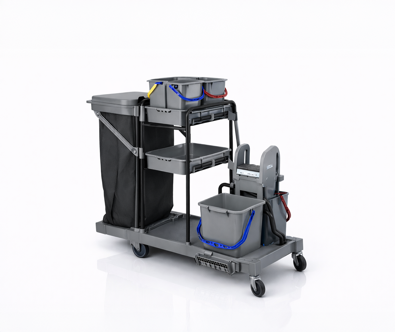 Chariot de ménage complet conçu pour structurer les interventions et améliorer la productivité des équipes sur le terrain.