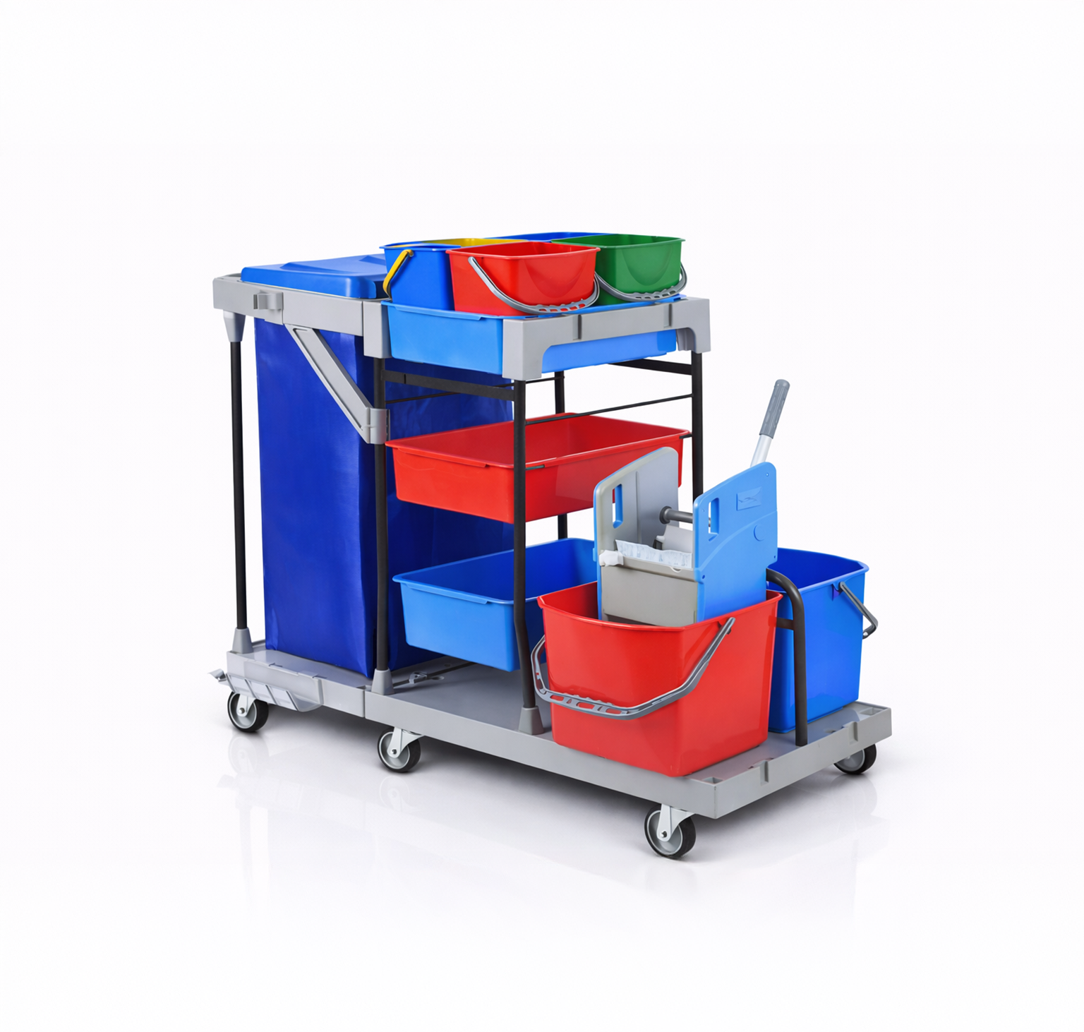 Chariot de ménage professionnel conçu pour organiser efficacement le matériel et optimiser les opérations de nettoyage au quotidien.