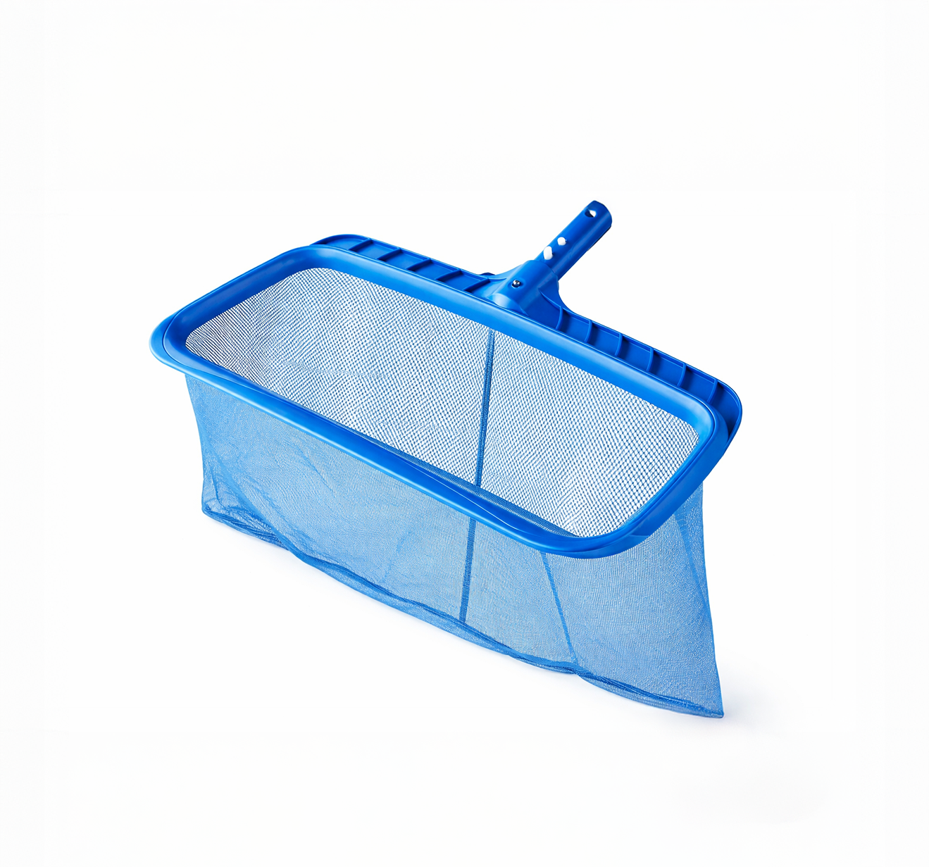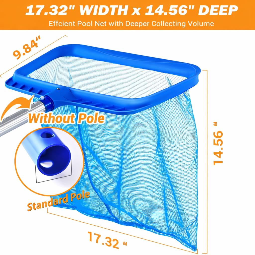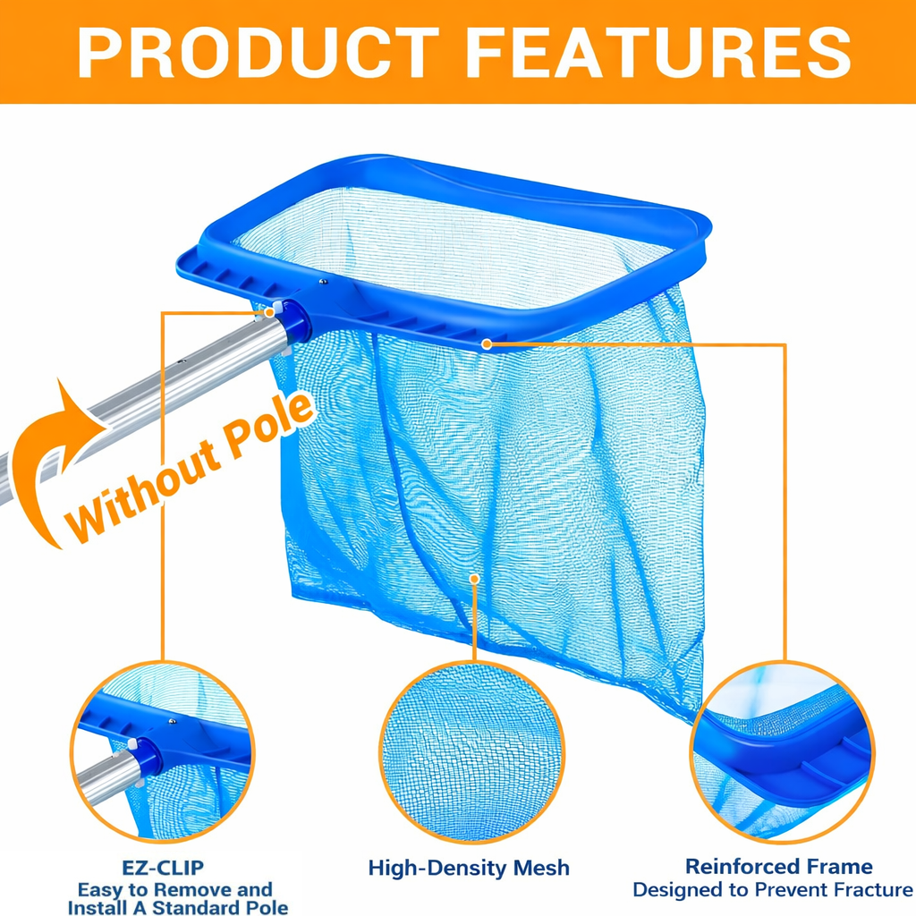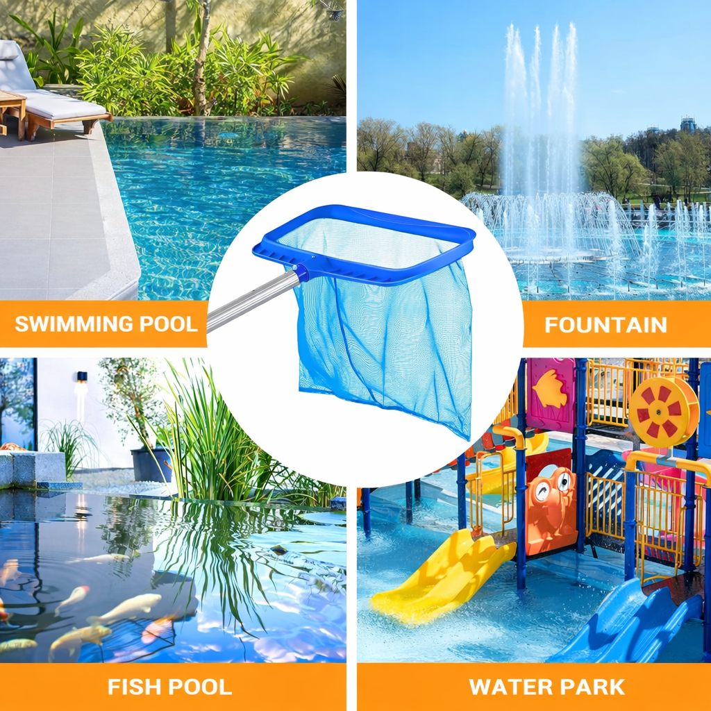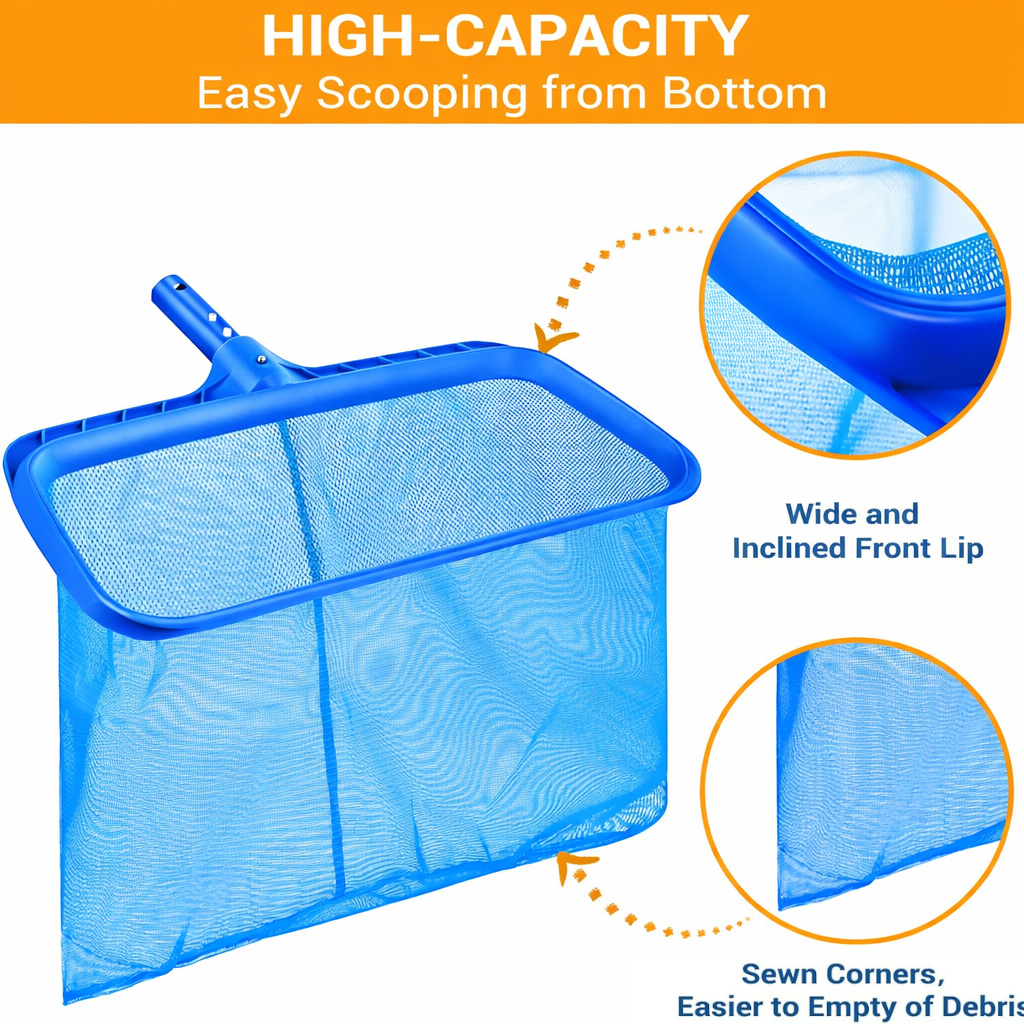 Épuisette de piscine conçue pour ramasser efficacement feuilles, insectes et débris flottants. Dotée d’un filet profond en nylon et d’un cadre renforcé, elle permet un nettoyage rapide et sans effort, même pour des volumes importants.