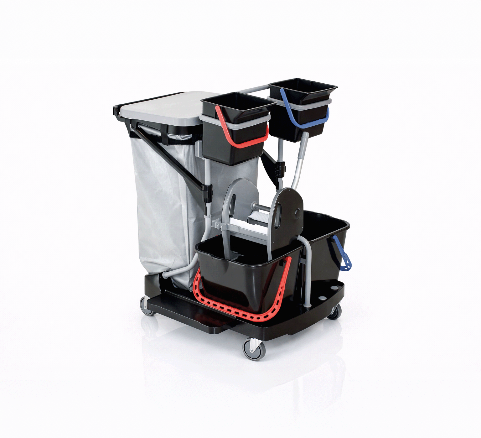 Chariot de nettoyage IPC Revolution conçu pour optimiser l’organisation et l’efficacité des opérations de nettoyage. Équipé de deux seaux avec essoreur 15 L et de deux bacs de 6 L dédiés aux produits, il permet une gestion claire et hygiénique des tâches.